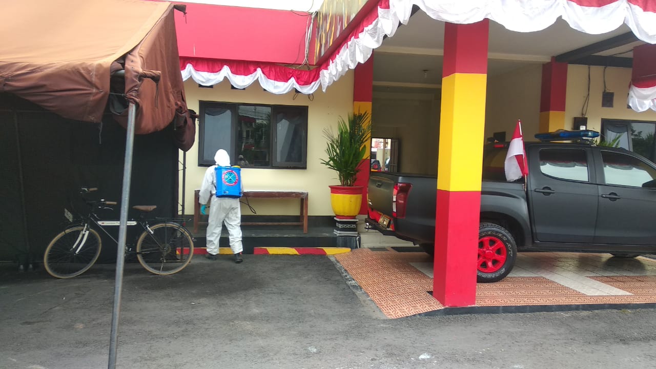 Personil Detasemen Gegana Unit KBR Satbrimob Polda DIY Melaksanakan Kegiatan Penyemprotan Rutin Disinfektan Yang Di Laksanakan di Sekitar Mako Satbrimob Polda DIY Guna Memutus Rantai Penyebaran Covid-19 .